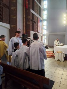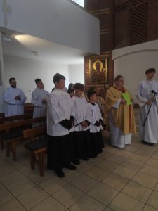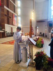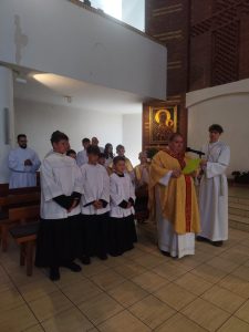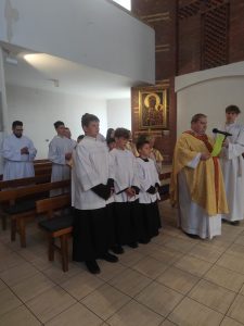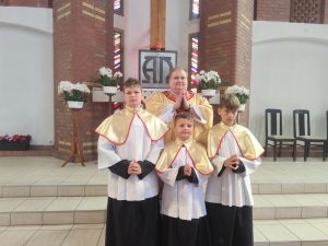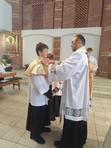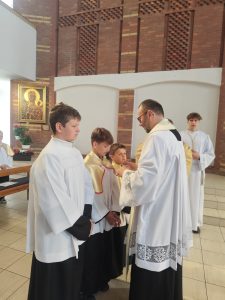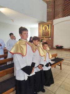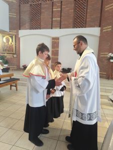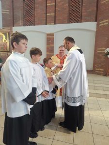 W niedzielę Dobrego Pasterza na Eucharystii sprawowanej o godz. 11.oo pod przewodnictwem ks. Łukasza Gorońskiego, trzech chłopców zostało włączonych w szeregi ministrantów naszej parafii. Kandydaci zostali wywołani po imieniu przez prezesa LSO i potwierdzili swoją gotowość słowem „jestem”. Następnie ks. Łukasz – opiekun LSO, poprosił ks. Proboszcza o ustanowienie ich ministrantami. Ks. Proboszcz zapytał czy kandydaci chcą pełnić tą posługę, dbać o czyste serce i służyć przy Ołtarzu na chwałę Boga i dla dobra drugiego człowieka. Chłopcy stanowczo odpowiedzieli: „chcemy”. Po poświęceniu szat liturgicznych nałożyli kołnierze. Dominikowi, Hubertowi i Janowi życzymy wytrwałości i zapraszamy kolejnych chłopców do naszej wspólnoty.